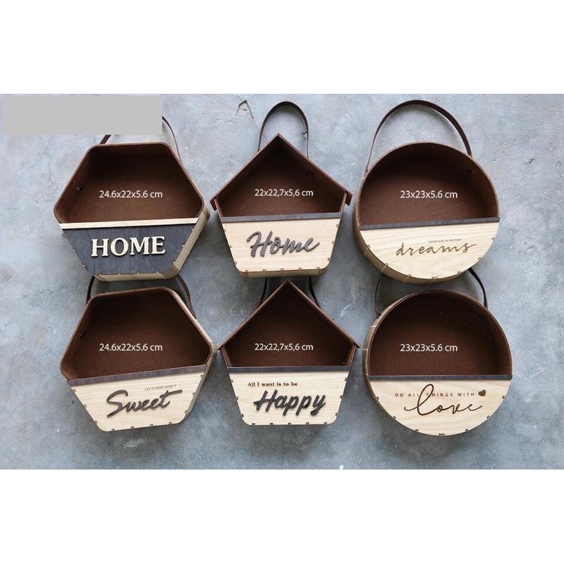 - Giỏ hoa treo tường chất liệu gỗ, đã được xử lý chống ẩm mốc, dây da, dán vải dạ và kết hợp dán chữ nổi 3D.