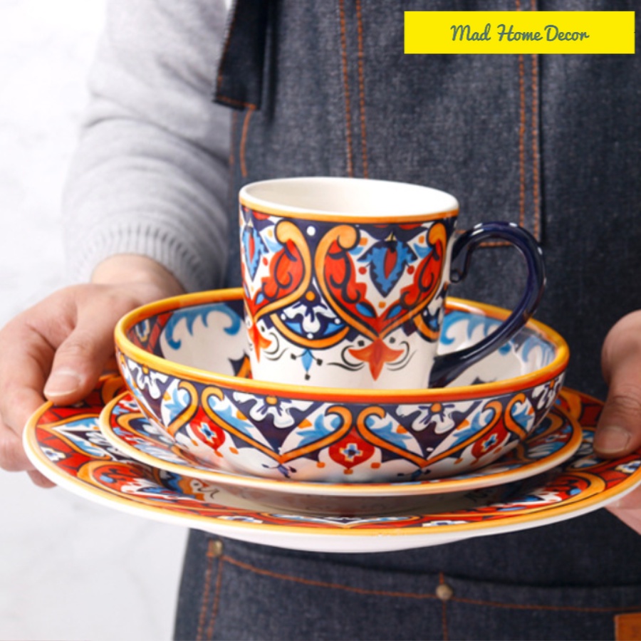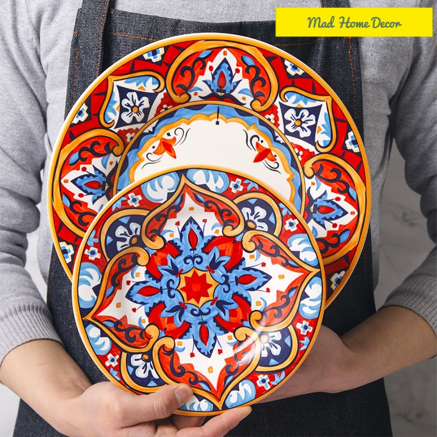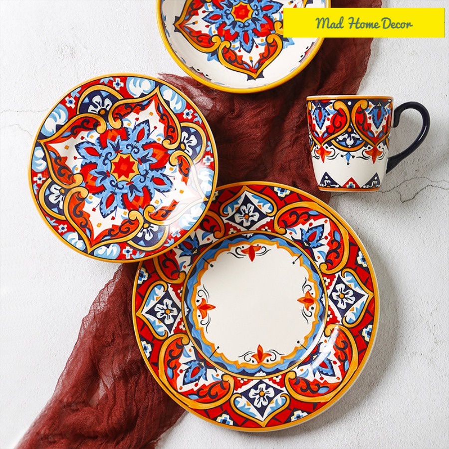 Nhà cửa & Đời sống > Bộ đồ bàn ăn > Dĩa || Set Karina 4 món gốm mĩ nghệ vẽ tay - Họa tiết thổ cẩm đỏ cam chuyên xuất khẩu Âu Mĩ của hãng OMKCòn hàng
