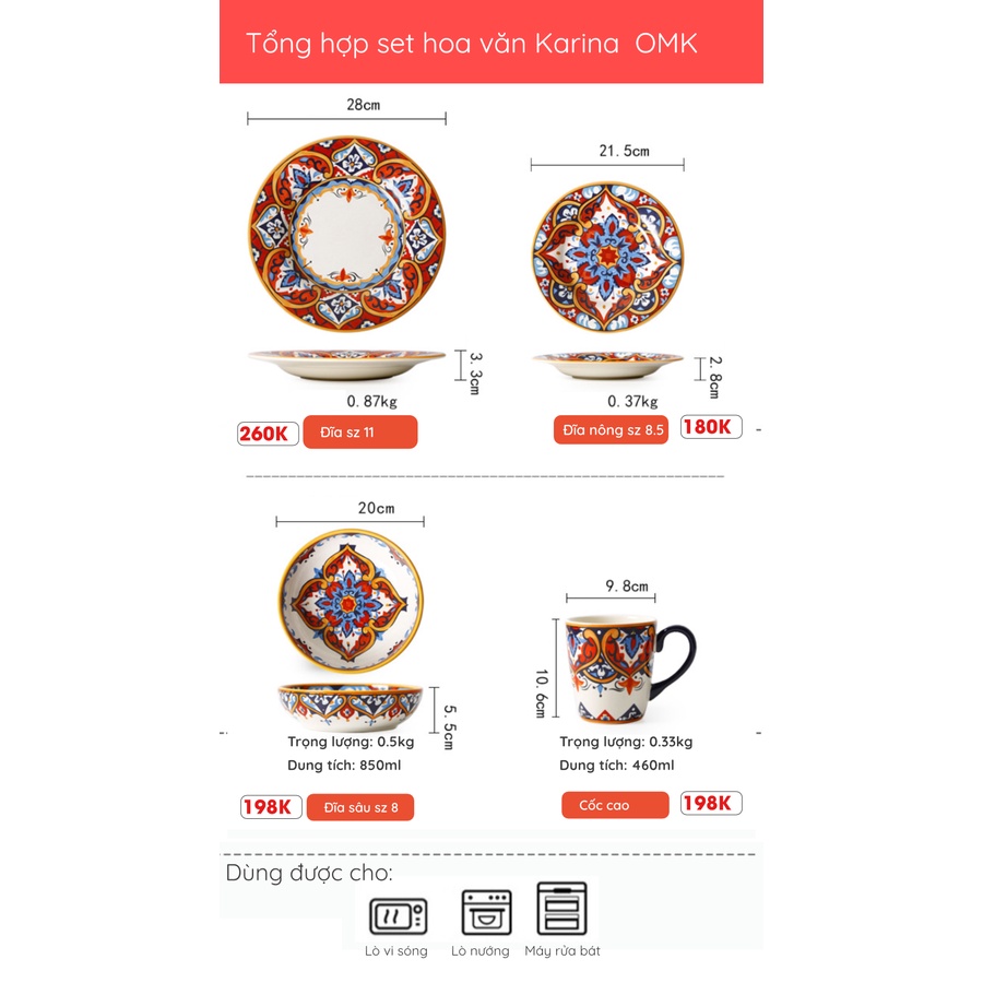 Giới thiệu Set Karina 4 món gốm mĩ nghệ vẽ tay - Họa tiết thổ cẩm đỏ cam chuyên xuất khẩu Âu Mĩ của hãng OMK