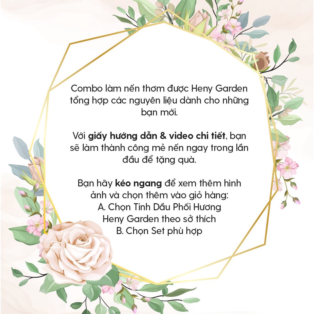 Còn gì tuyệt vời hơn khi bạn tự mình làm một cốc nến thơm nhỉ? Heny tin chắc đây sẽ là trải nghiệm rất vui mà bạn có thể khám phá sau 1 tuần làm việc mệt mỏi.► Combo tự làm nến thơm đa dạng từ việc lựa chọn tinh dầu thơm phối hương theo sở thích, cho đến nhiều loại set (1-2 cốc) tùy theo nhu cầu của từng bạn. Bộ sưu tập bạn đang xem là những mùi hương yêu thích thuộc nhóm gỗ tại Heny Garden.