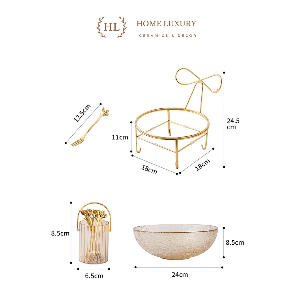 Set Lẵng Thủy Tinh Kèm Nĩa + Bát Thủy Tinh Đựng Hoa Quả Kèm Kệ Inox Vàng Màu Hổ Phách - Khói Xám Phong Cách Vintage 2022Chất liệu: Thủy Tinh Sần Borosilicate