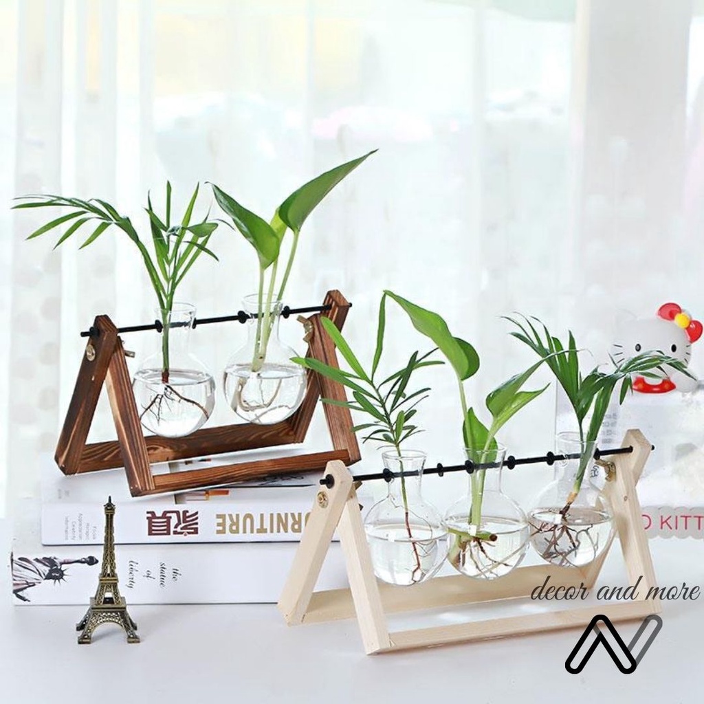 Set lọ thủy tinh trồng cây thủy canh kèm đế gỗ trang trí bàn làm việc