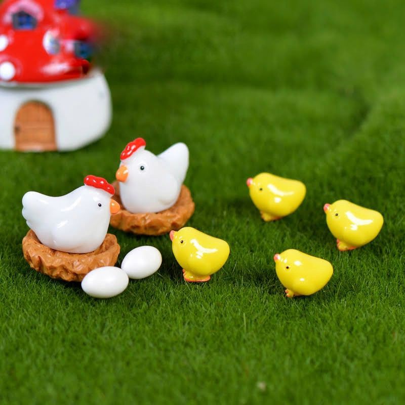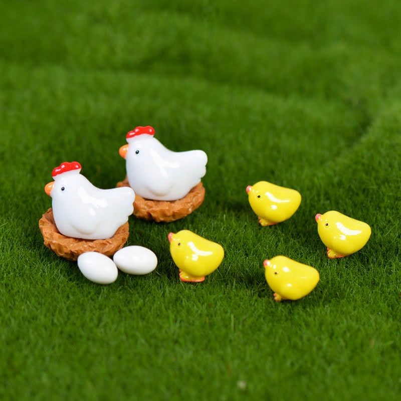 set mô hình đàn gà cực dễ thương nhatiểu cảnh mini size nhỏ: gà mẹ ~2cm, gà con ~1cm ạ