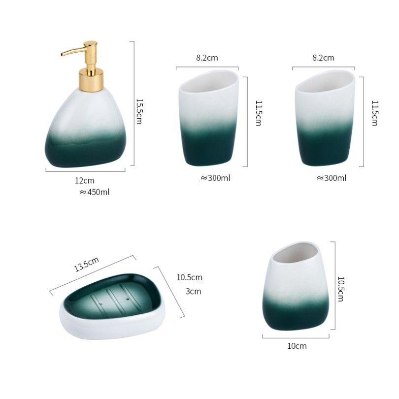 - Kích thước: Chai kit: 12x15.5 cm, Ly cao: 8x11.5, Ly thấp: 10x10.5 cm, Đế xà phòng: 13.5x10.5x3 cm, Khay: 2x25 cm