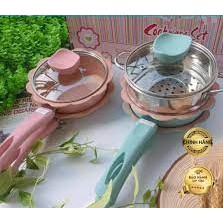 Set Nồi Chảo Đá Tráng Men Chống Dính Cao Cấp Kèm Xửng Hấp (Màu hồng)