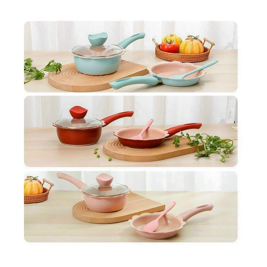BỘ NỒI CHẢO ĐÁ CHO BÉ ĂN DẶM CAO CẤP TRÁNG MEN CHỐNG DÍNH, KÈM XỬNG HẤP-Nồi và chảo được làm từ hợp kim cao cấp 6 lớp tráng men hoa văn đá chống dính cực tốt, thiết kế hình hoa cực dễ thương màu sắc trang nhã.