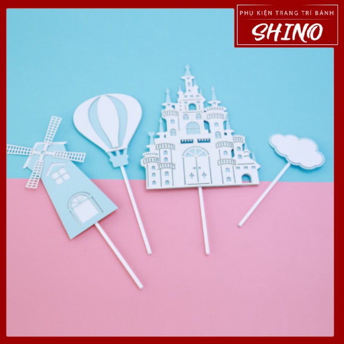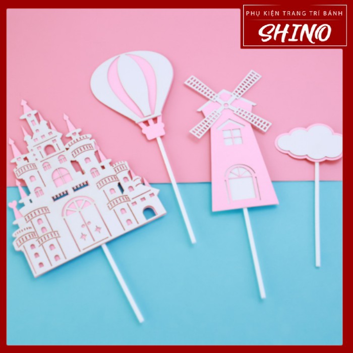 Chất liệu: công chúa và hoàng tử búp bê nhựa nhẹ, que cắm giấy ép kim lâu đài, khinh khí cầu, cối xay gió.