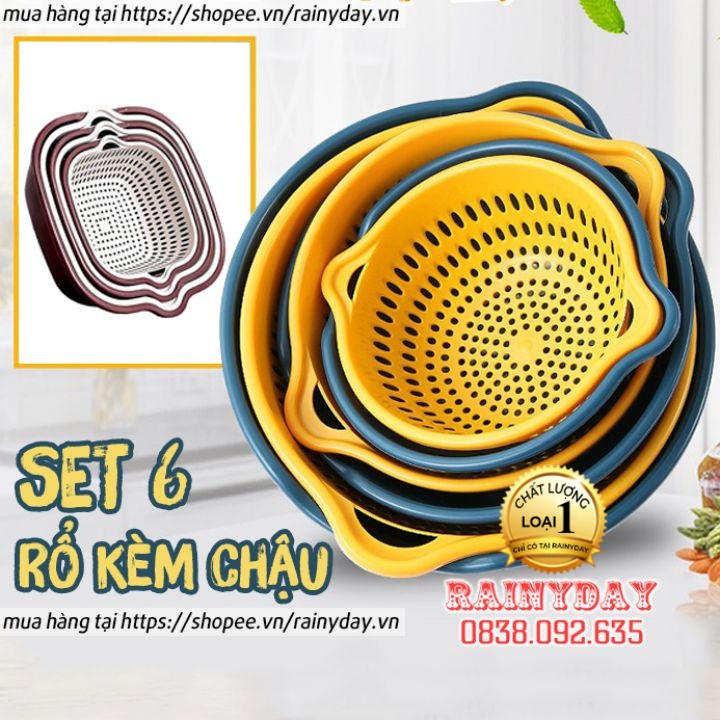 Set rổ kèm chậu 6 món bộ 3 rổ và chậu thau nhựa rửa rau củ đựng hoa quả trái cây 2 lớp hình tròn, vuông