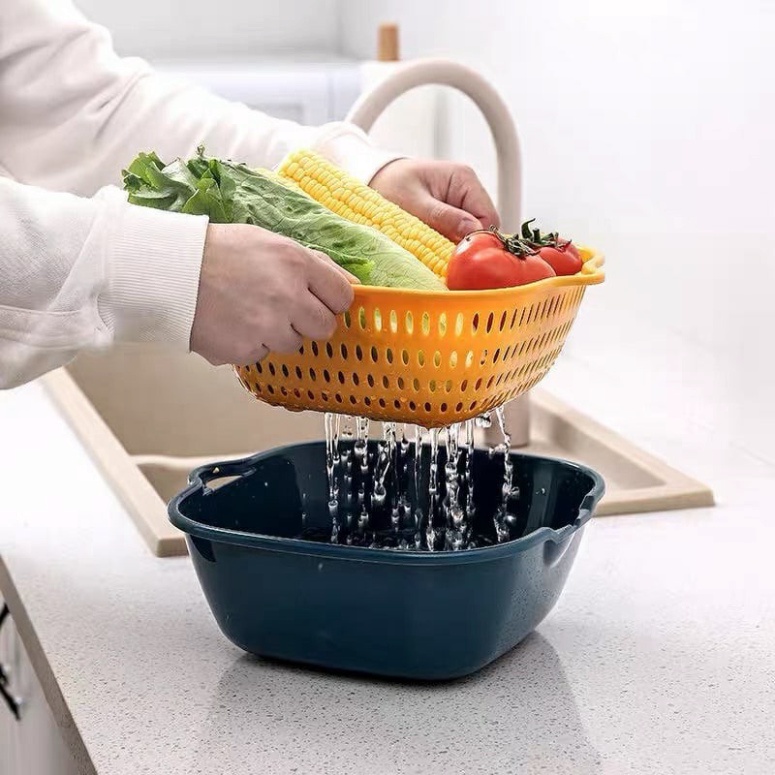 Kết hợp 2 loại rổ thành một đôi, một chiếc có công dụng để ráo, 1 chiếc để đựng nước, mang lại hiệu quả mỗi khi ngâm, rửa
