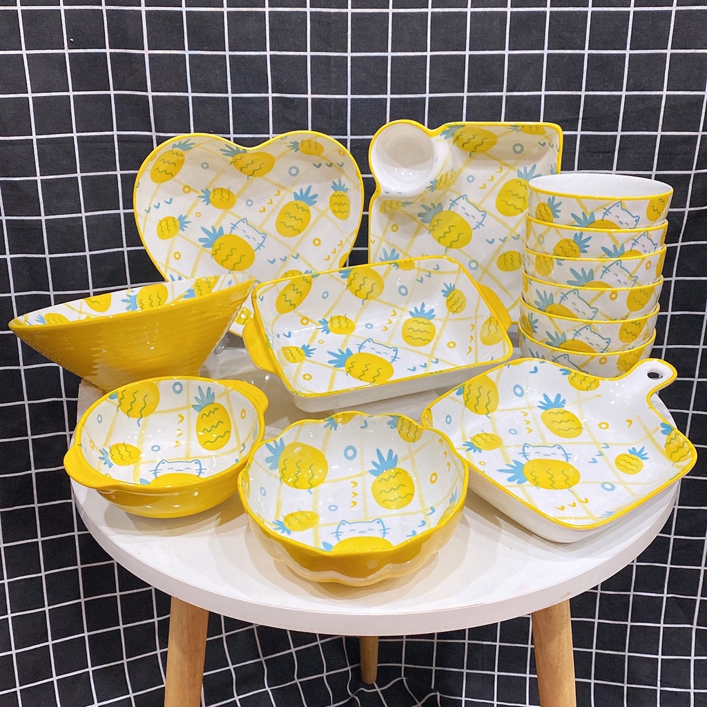 [Set] Set Bát Đĩa Chén Dĩa Sứ Dứa Vàng Bát Ăn Cơm, Decor Dễ Thương
