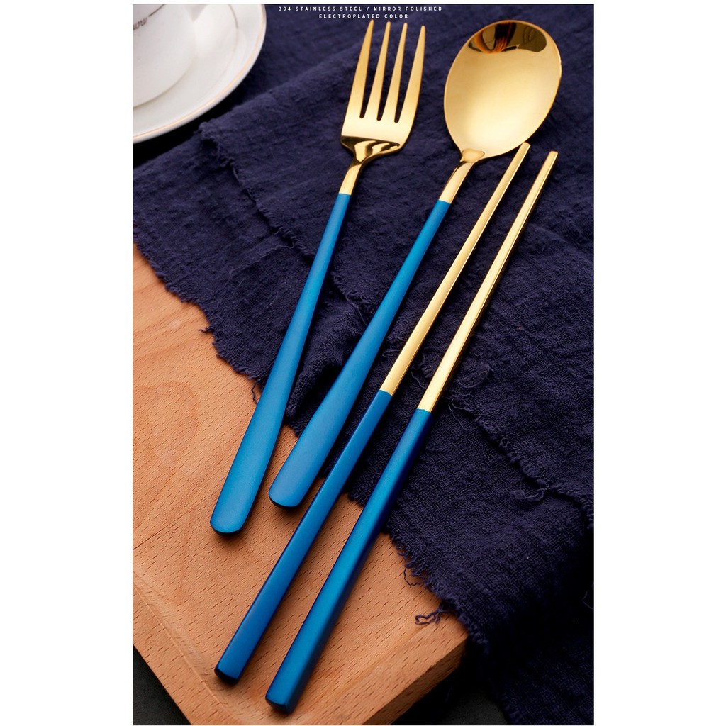 Bộ dao thìa dĩa đũa phong cách Hàn Quốc được làm bằng chất liệu Inox 304 nguyên chất, màu sáng bóng bền đẹp theo thời gian và không bị han gỉ trong mọi điều kiện tự nhiên. Kiểu dáng thanh mảnh, tay cầm có cán bọc màu xinh xắn cầm gọn chắc tay. Đũa inox kèm theo có thể sử dụng thay thế đũa tre/gỗ thông thường, khắc phục được các vấn đề vệ sinh sau ăn, dễ rửa trôi, tránh nấm mốc gây hại sức khỏe.- Bộ dao thìa dĩa còn có thể sử dụng khi ăn các món hàng ngày như cơm, canh, mì bún phở...đều rất phù hợp và tiện lợi.