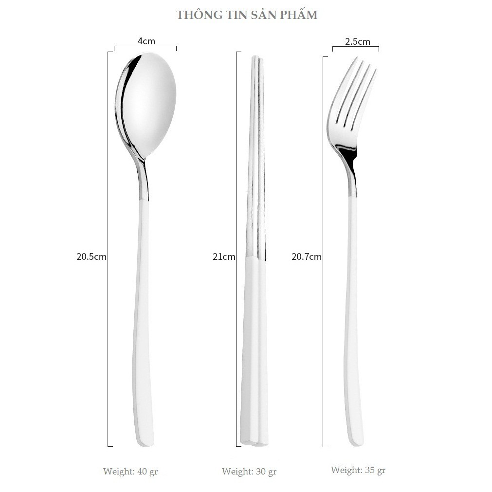 Bộ gồm 03 món: 1 thìa + 1 dĩa + 1 đôi đũa bằng inox 304. Thông tin và kích thước chi tiết từng món đều có trong ảnh mô tả, bạn hãy kích vào ảnh để xem hết.