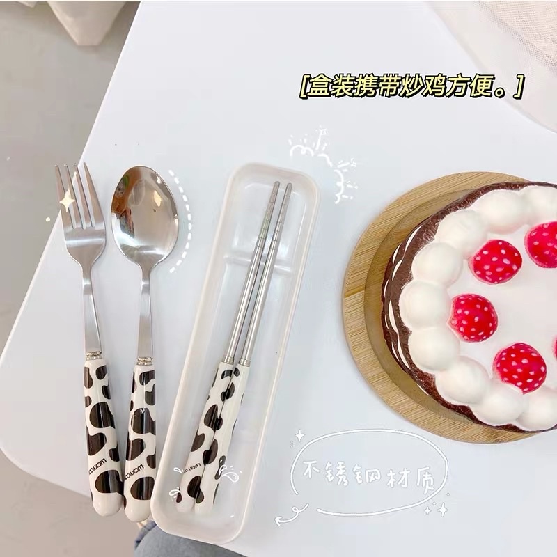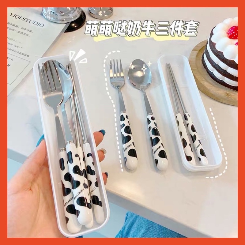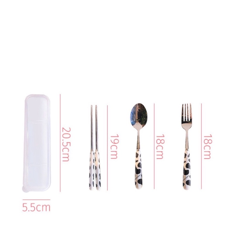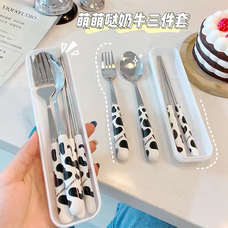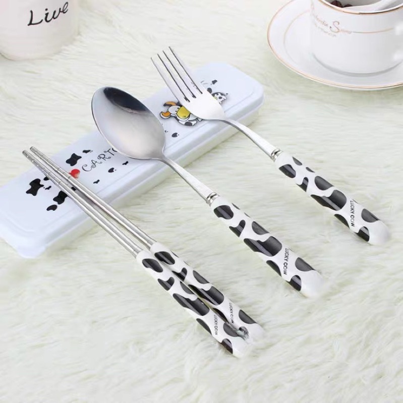 Bộ dụng cụ ăn cá nhân thìa đũa dĩa bằng inox, cán sứ có hộp đựng xin xắn tiện dụng họa tiết bò sữaBộ Đũa Thìa Dĩa INOX 304 kèm hộp đựng tiện lợi du lịch sang trọng đẹp mắt sạch sẽ an toàn