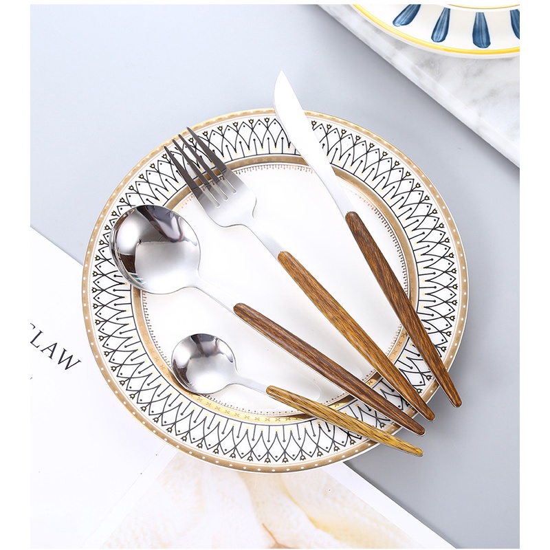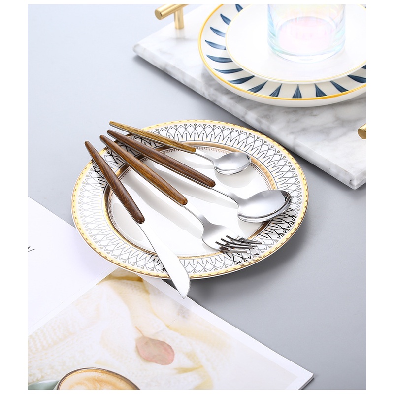 Set thìa nĩa dao mạ vàng cán gỗ sang trọng cho bàn ăn