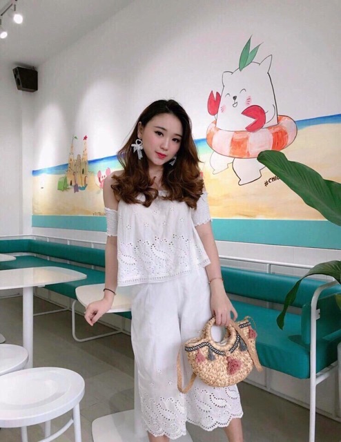 Áo bẹt vai kết hợp vs quần lửng ống suông đục lỗ hoạ tiết❤️