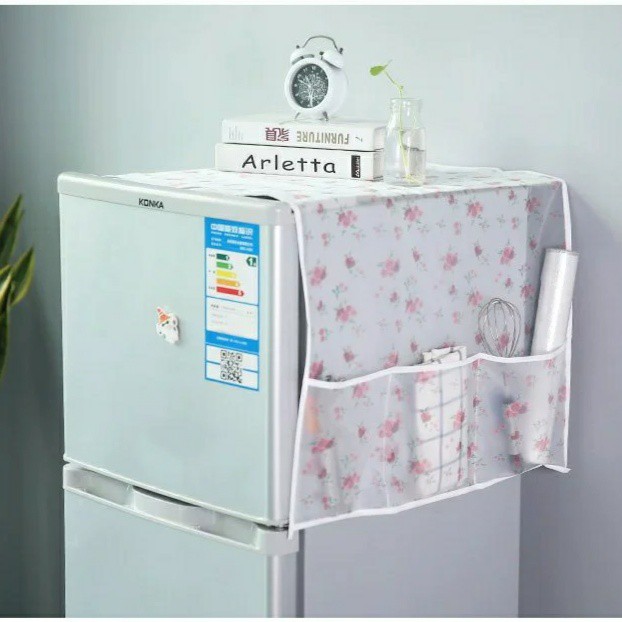 Tấm phủ tủ lạnh. Khăn phủ vừa vặn lên phần đầu tủ, che được cả 2 bên hông tủ. Hai bên đầu có 3 ngăn nhỏ để đựng những vật dụng cần thiết hay những đồ trang trí xinh xắn.