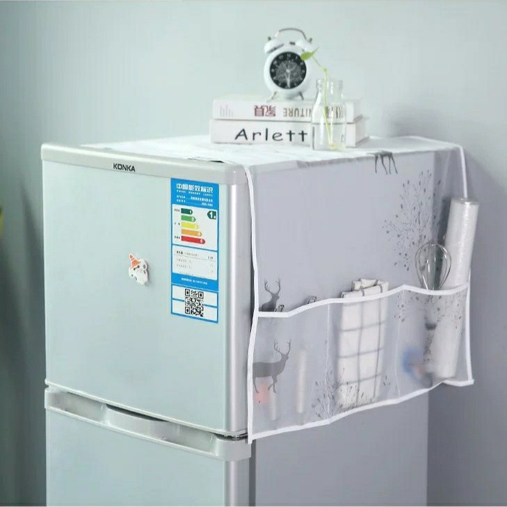 Tấm phủ tủ lạnh. Bảo vệ nóc tủ lạnh, tránh bụi bẩn và chống thấm nước tốt, giúp giữ tủ lạnh sạch sẽ. Chất liệu nhựa PVC dai bền, chống thấm tốt, dễ dàng vệ sinh, chùi rửa.