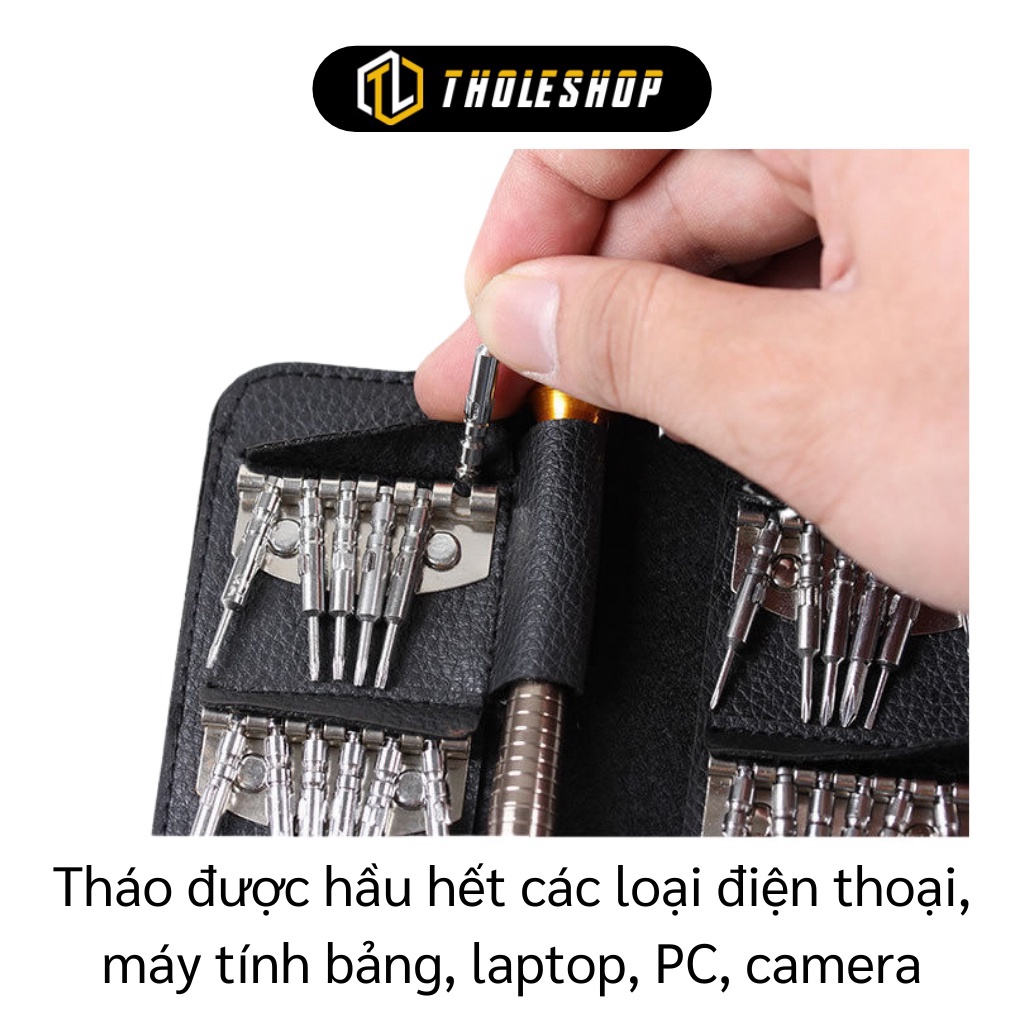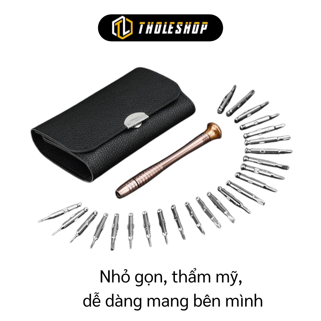 + Bộ tua vít ví da sửa chữa đồ điện tử 25 đầu siêu tiện ích, 25 chi tiết : 24 đầu tua vít + 1 thân lắp đầu tua vít, Bao da có kích thước nhỏ gọn, rất vừa túi và chuyên nghiệp.