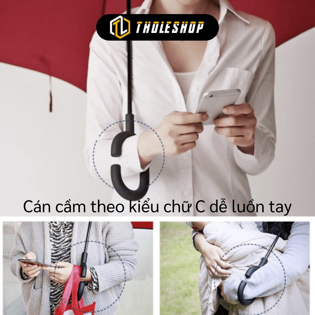 + Cán cầm: theo kiểu chữ C nên chúng ta có thể luồn tay vào trong để vừa giữ dù và vừa cầm điện thoại để làm việc hay giải trí, cho phép cầm nắm nhiều đồ dùng khác
