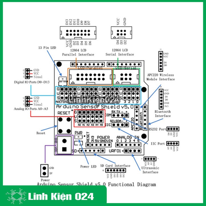 Các cổng kết nối trên Arduino Sensor Shield bao gồm: