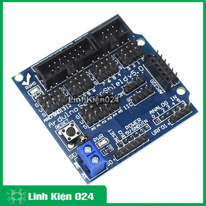 Shield Cảm Biến Arduino UnoArduino Sensor Shield Uno được sử dụng với Arduino Uno hoặc các phiên bản Arduino có cùng kiểu chân và kích thước như Arduino Uno, có tính năng như một đế ra chân các chuẩn giao tiếp Digital, Analog, UART, I2C, LCD,...giúp bạn dễ dàng kết nối các module, cảm biến để thực hiện nhiều chức năng khác nhau. Chúng ta có thể xây dựng các dự án về điện tử một cách dễ dàng nhờ kết nối tương thích với Arduino với các ngõ digital, analog, giao tiếp I2C và UART. Mỗi module có một ngõ cấp nguồn riêng cho thiết bị ngoại vi khi kết nối với shield. Dễ dàng điều khiển các thiết bị như động cơ rc servo, cảm biến vật cản,...
