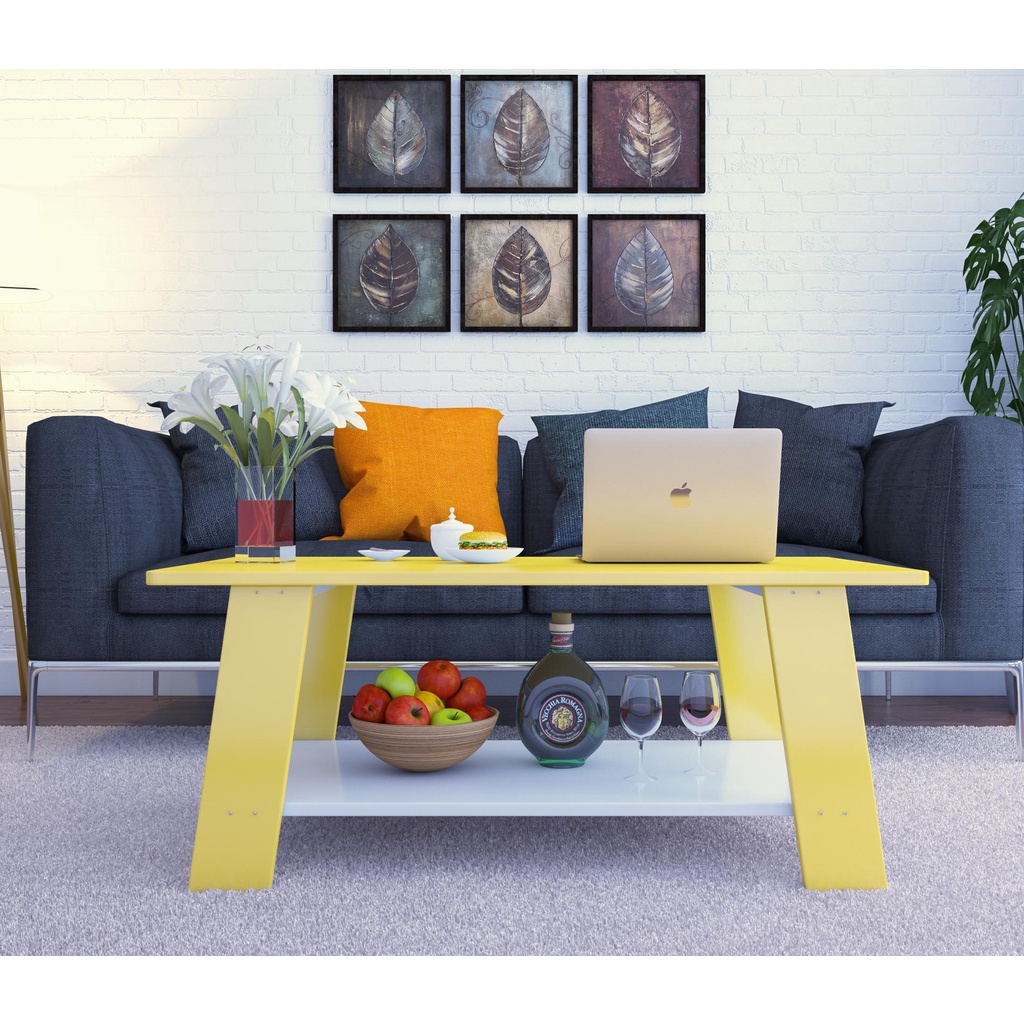 - Chất liệu: Gỗ MDF phủ Min/ Độ dày: mặt bàn trên màu Vàng gỗ 17mm, mặt bàn dưới màu Trắng gỗ 12mm.