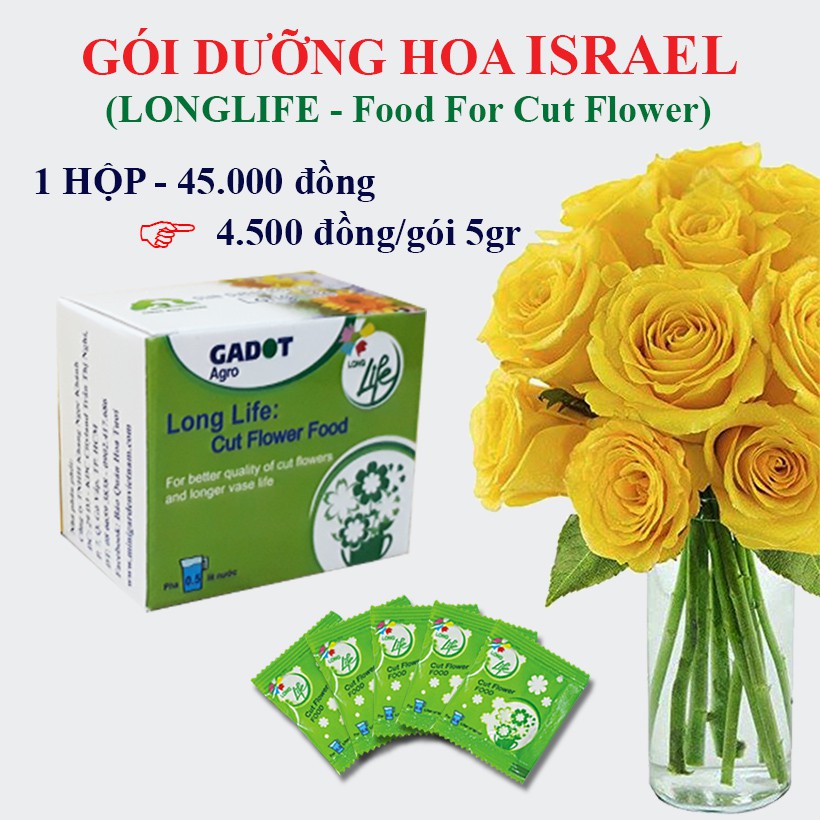 Long Life Israel - dưỡng chất dạng bột, giúp hoa cắt cành tươi lâu hơn.Hộp gồm 10 gói 5gr, giành cho người chơi hoa.