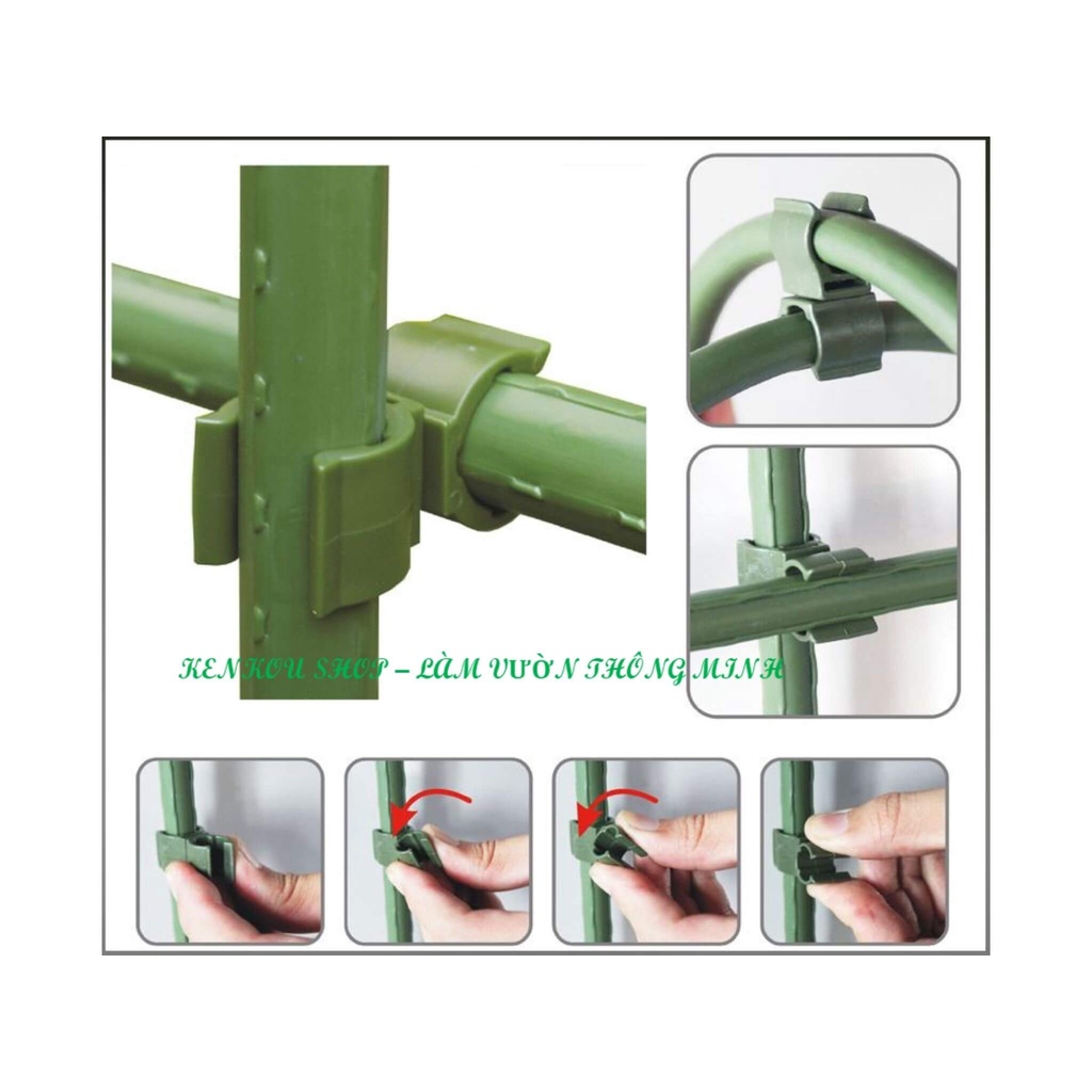 - Có thể cố định các que, cọc giàn leo với nhau theo phương vuông góc, hoặc xoay theo ý muốn, chắc chắn, thao tác dễ dàng, giúp bạn có được giàn mướp, giàn bầu, giàn đậu, giàn dưa leo, giàn hoa hồng, giàn hoa,...một cách nhanh chóng.