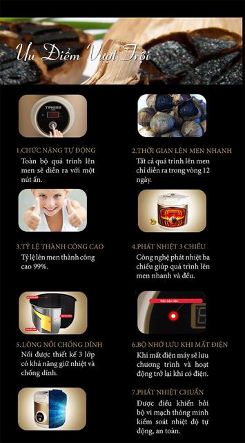 Với công nghệ đột phá trong quá trình nghiên cứu lên men tỏi, máy làm tỏi đen TIROSS TS904 đã rút ngắn thời gian lên men tỏi và tăng khả năng thành công lên 99% so với cách làm thủ công. Với cách.làm thủ công, bạn có thể mất tới 45-60 ngày cho 1 lần làm và tỷ lệ thành công thấp. Nay với máy làm tỏi đen TIROSS TS904, công việc.làm tỏi đen được rút ngắn xuống chỉ còn 12 ngày. Đơn giản và hiệu quả chỉ với 1 nút ấn, toàn bộ quá trình lên men tỏi sẽ được thực.hiện hoàn toàn tự động. Công việc của bạn bây giờ chỉ là chờ đợi và thưởng thức tỏi đen.....