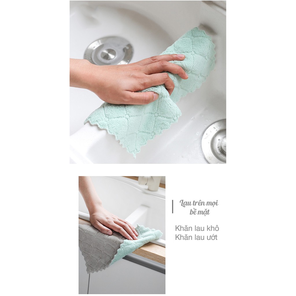 - Khăn Lau Bếp Đa Năng 2 Mặt làm sạch vết bẩn, hiệu quả trong việc lau sạch và làm khô chén dĩa, ly tách,..