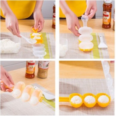 Hàng xuất Nhật có bao bì đầy đủ1 bộ gồm 1 muôi cơm nhỏ xinh, 1 tay cầm với 3 khuôn lắc như hình, trên khuôn lắc có in nổi hình gấu xinh yêu.