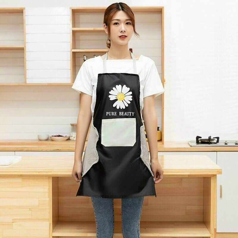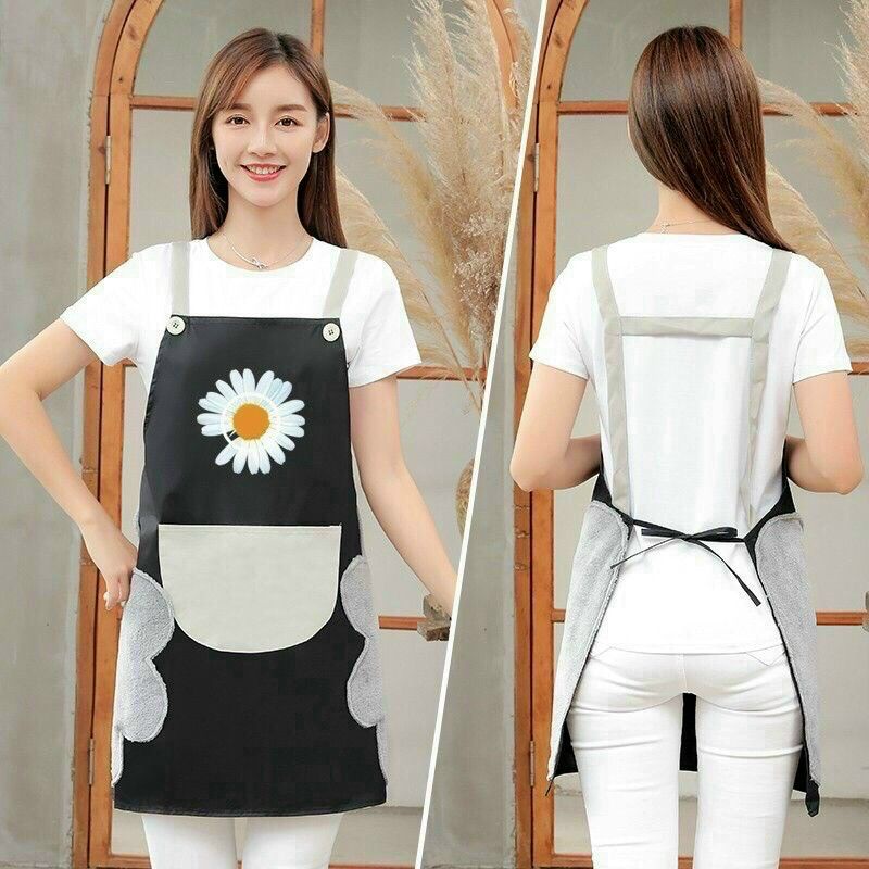 TẠP DỀ HOẠ TIẾT HOA CÚC CHỐNG THẤM- Sản phẩm được làm từ vải dù chắc chắn, kèm bên cạnh hông là 2 miếng vải thấm hút nước tiện dụng cho việc lau khô tay