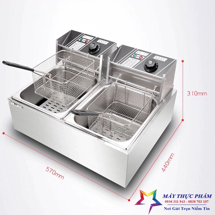 – Bếp chiên nhúng điện đôi 2 giỏ 6X2 lít: bếp chiên khoai tây, chiên gà, đùi gà, cánh gà, xúc xích, thịt bò... Bếp chiên đa năng thiết kế bằng inox không rỉ, có thể tháo rời dễ dàng thuận lợi cho vệ sinh.