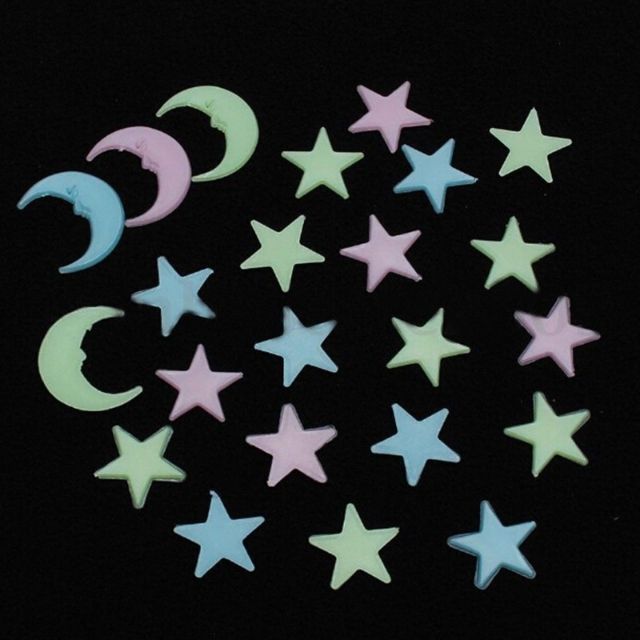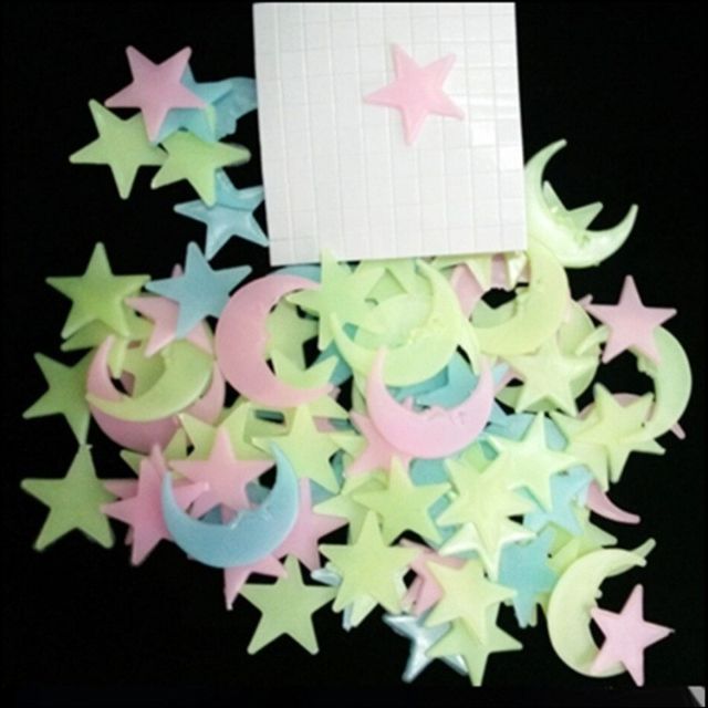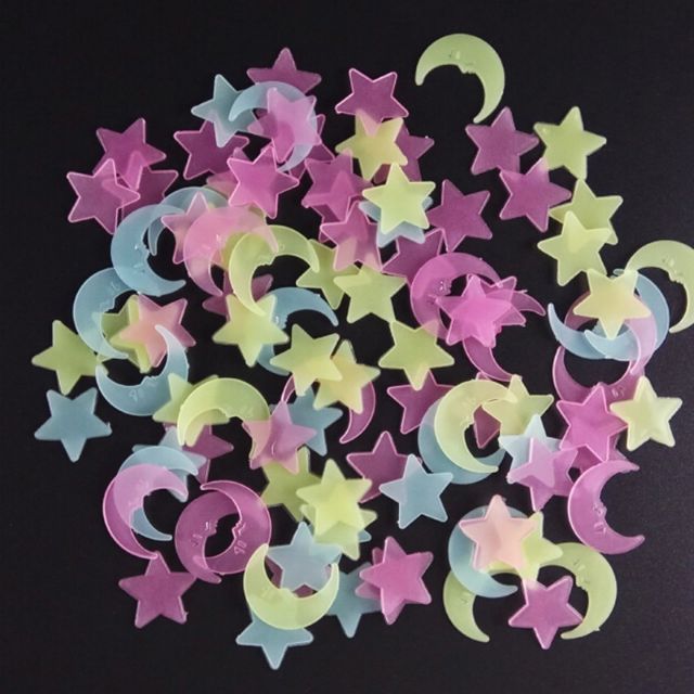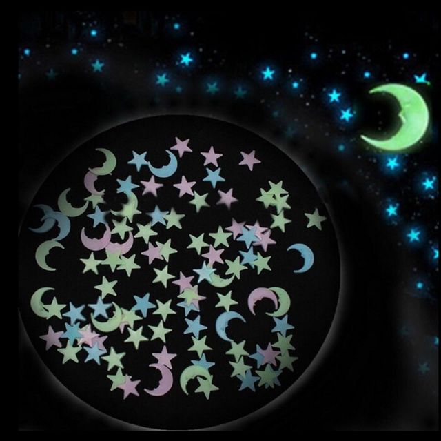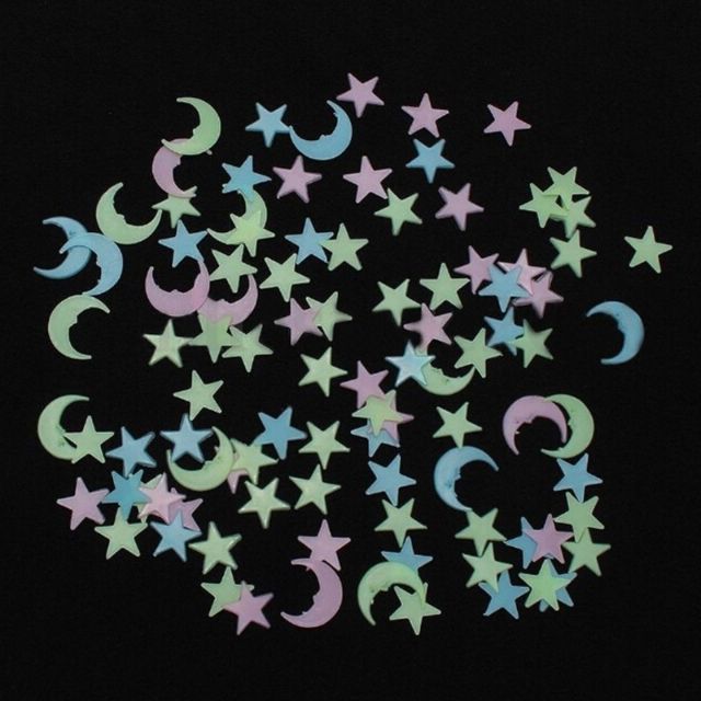 Tên sản phẩm: Combo 100 trăng sao dạ quang phát sáng trong đêm- Sản phẩm gồm : 100 chi tiết ( Mặt trăng + Ngôi sao + Kèm băng keo 2 mặt )