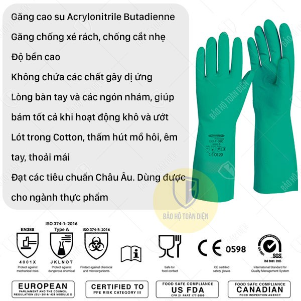 Tiêu chuẩn: EN388 (3001, chống mài mòn cấp độ 3, và chống đâm xuyên cấp độ 1), EN374-1 Type A (chống hóa chất 40%)