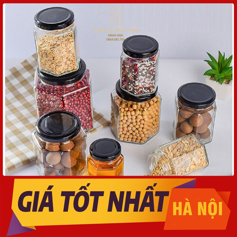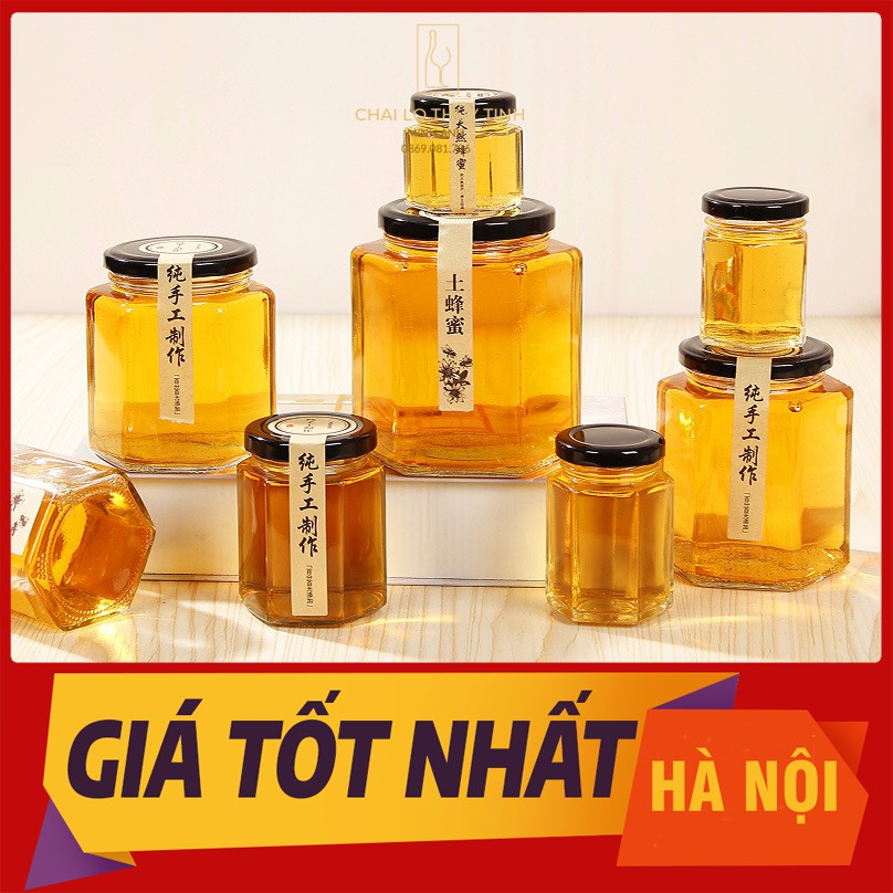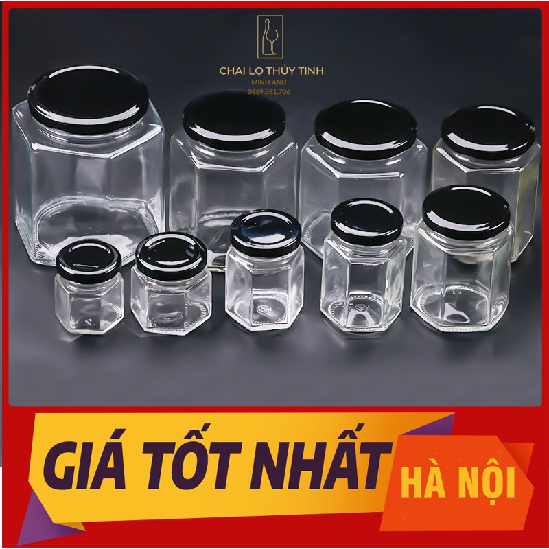 Hũ thủy tinh nắp thiếc hình lục giác 6 cạnh thể tích 45ml đến 730ml, công dụng chuyên làm hũ đựng dầu dừa, hũ đựng mật ong, mỹ phẩm, hũ thủy tinh đựng kẹo handmade, hũ đựng thực phẩm, hũ đựng yến sào