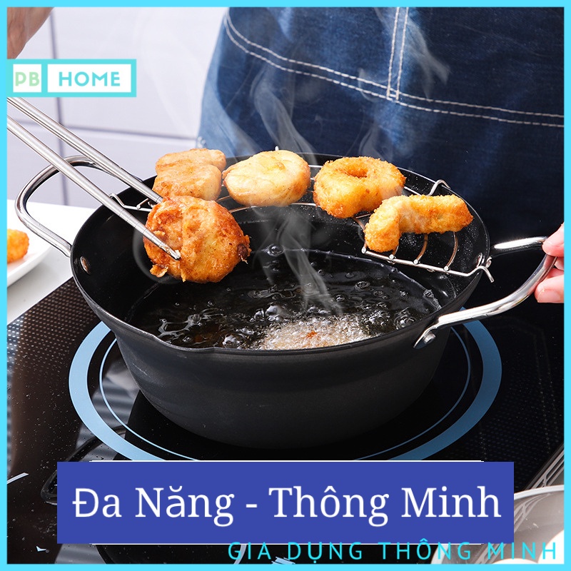 Chảo chống dính sâu lòng có thiết kế phần miệng giúp dễ dàng rót dầu thừa, kèm vỉ gác chảo giúp làm ráo dầu thức ăn rất tiện dụng.