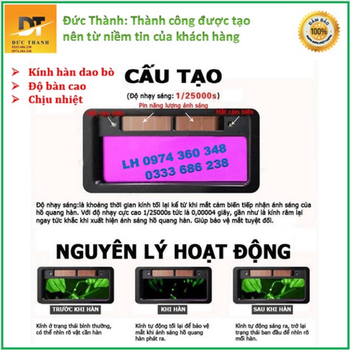 Kính tự động tối lại khi có hồ quang hàn, tự sáng ra khi không có hồ quang hàn.