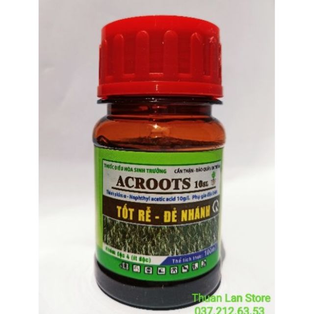 #Công dụng:- ACROOTS 10 SL chứa Auxin α - NAA có công kích thích ra rễ cực mạnh, đẻ nhánh nhiều, mập mầm, xanh cây, xanh lá... Thích hợp cho mọi giai đoạn phát triển của cây trồng.