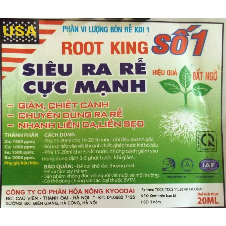 Quy cách bao gói: 20ml/ống dạng dung dịch đậm đặc. Chế phẩm có thành phần chính là các vi lượng (Z, Cu, Fe, Bo.. ) và phụ gia hữu hiệu (vitamin và các chất điều hòa sinh trưởng khác) nhằm kích thích cây trồng sản sinh rễ mới, tăng khẳ năng hấp thụ chất dinh dưỡng của cây trồng.Sản phẩm giúp phát triển mạnh bộ rễ, kích thích cành chiết, cành giâm, cây ươm sớm ra rễ, cành ghép, mắt ghép mau liền sẹo…Hình thành nhanh cây con, cứng cây với bộ tán cân đối và bền vững.Cải thiện mạnh nền đất, chuyển đổi các chất dinh dưỡng trong đất sang dạng dễ hấp thu, giúp các hệ sinh vật hoạt động mạnh, cây tăng trưởng nhanh.Đặc biệt cây phục hồi nhanh và tái sinh hệ rễ mới sau đợt ngập lụt, hạn hán, phèn mặn.Cách dùng: Dùng tưới cây con: Pha 15-20ml cho 16 lít nước, tưới đều quanh gốc.