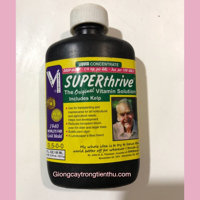 – Super thrive 60ml USA có thành phần là các chất vitamins và các hoocmon thực vật kích thích tăng trưởng cho cây trồng, bổ sung 50 hormon làm phá vỡ sự chậm phát triển của cây. Làm cây mau ra rễ, chồi, hoa,… Rất tốt cho lan.