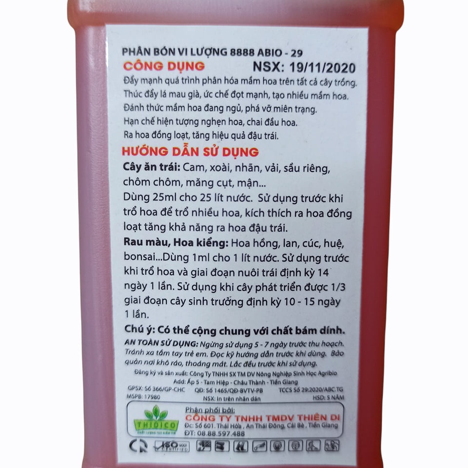 Hướng dẫn sử dụng - Cây ăn trái: Cam, xoài, nhãn, vãi, sầu riêng, chôm chôm, măng cụt, mận....: Dùng 25ml cho 25 lít nước. Sử dụng trước khi trổ hoa để trổ nhiều hoa, kích thích ra hoa đồng loạt tăng khả năng ra hoa đậu trái