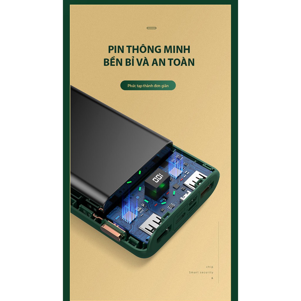- Công suất pin siêu lớn, dung lượng lên tới 20.000mah, đáp ứng mọi nhu cầu sử dụng trong ngày.
