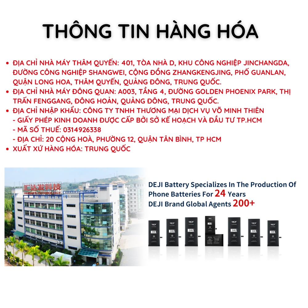 🍀 Nhà máy Shenzen Huidafa Technology thành lập năm 2006 tập trung vào sản xuất pin điện thoại di động (iPhone, Samsung, Huawei, Xiaomi, LG, Sony, Oppo...), pin ipad, thiết bị sạc không dây, pin dự phòng và các sản phẩm điện tử tiêu dùng khác.