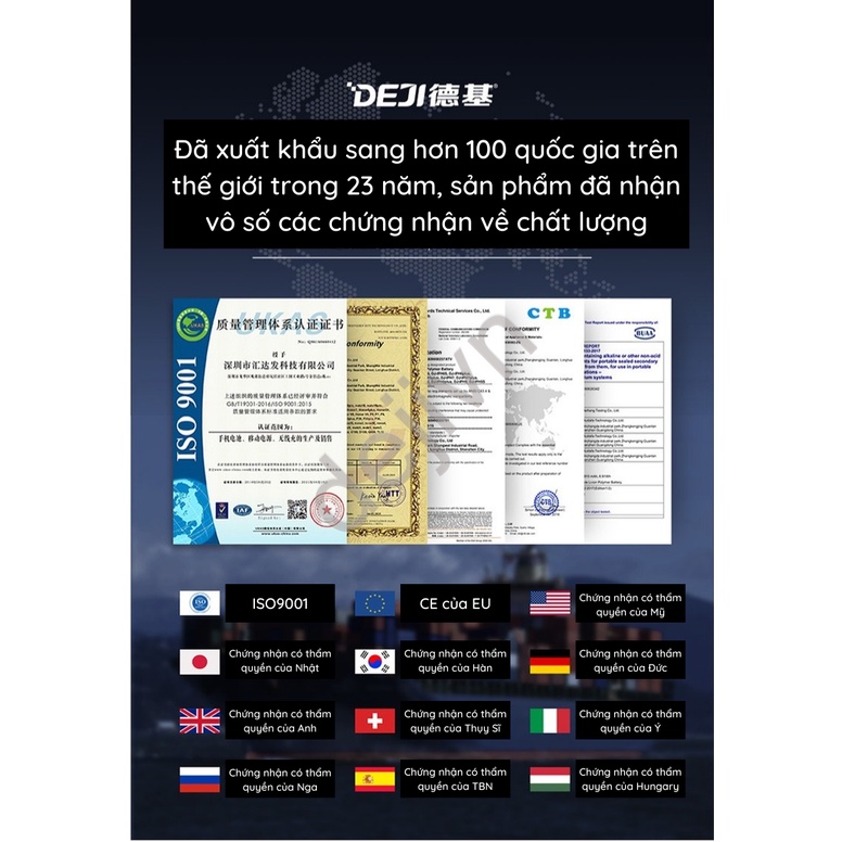 🍀 Thương hiệu pin DEJI ra đời năm 2009 và được mở rộng ra hàng trăm đại lý trên toàn thế giới, trở thành thương hiệu nổi tiếng toàn cầu.