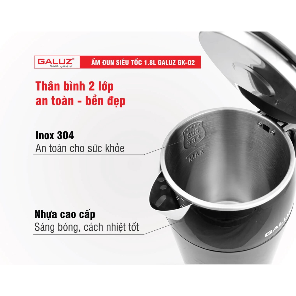 [ Siêu rẻ] Ấm đun nước siêu tốc Galuz GK-02, dung tích 1.8L, công suất 1500w, thân ấm bằng inox 304 cách nhiệt BH 1 năm