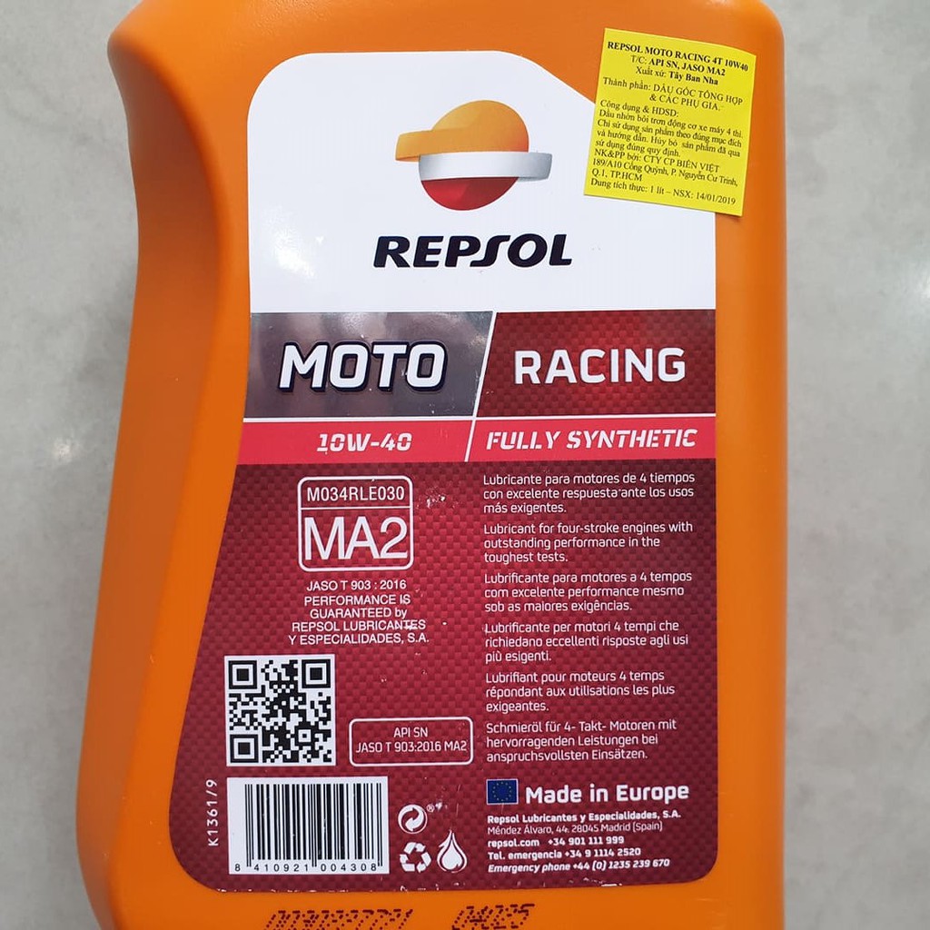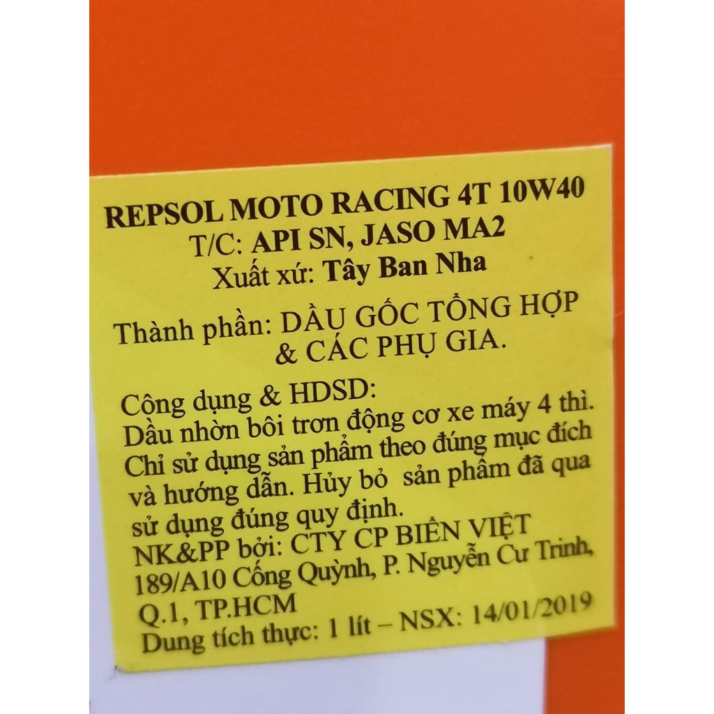 Ô tô > Dầu nhớt và phụ gia ô tô > Mỡ & Chất bôi trơn || [Siêu Rẻ] Nhớt Repsol Racing 10W40 4T Fully Synthetic 1 Lít cho mọi loại xe máy. DoChoiXeMayCòn hàng