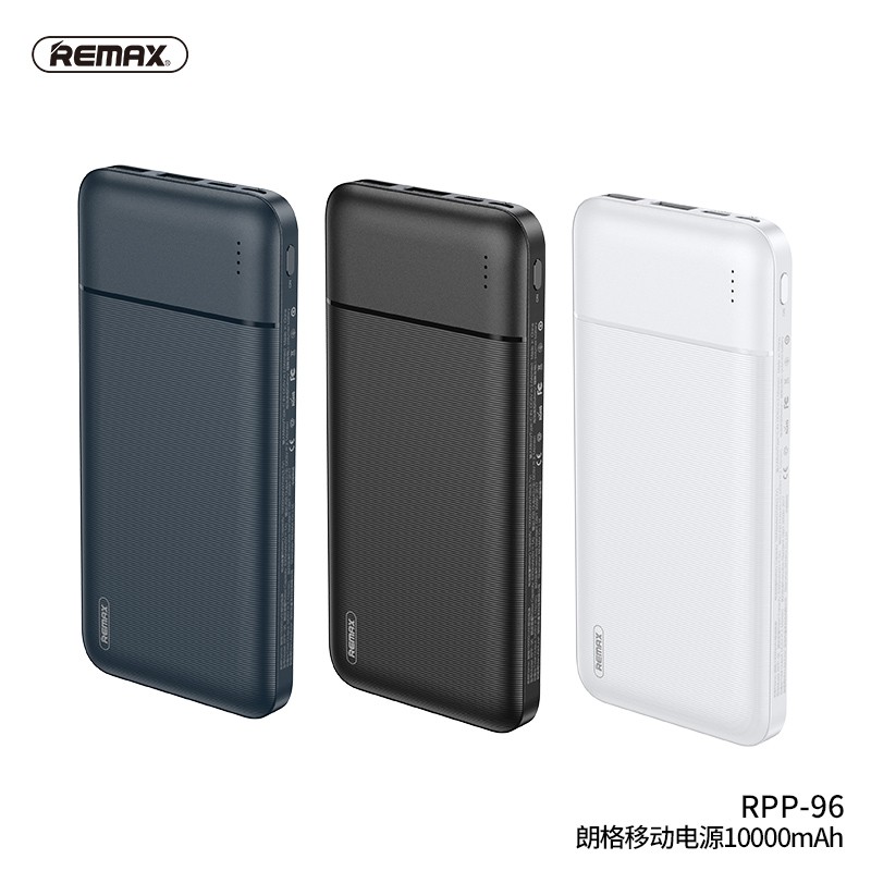 - Pin Dự Phòng 10000mah Remax RPP-96 Jany Series 2 cổng USB được trang bị 2 cổng ra cho phép bạn sạc kép cùng lúc 2 thiết bị. Với nguồn ra tối đa tổng 2.1A và dòng điện ổn định RPP-96 là nguồn năng lượng di động an toàn cho mọi thiết bị.