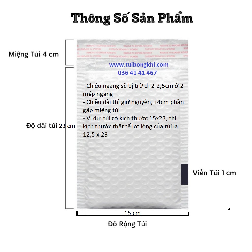- Ví dụ: túi có kích thước 15x23, thì kích thước thật tế lọt lòng của túi là 12,5 x 23