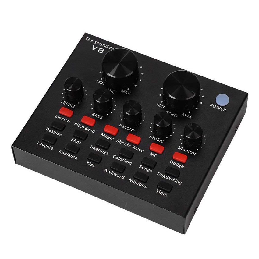 Sound card thu âm V8 là sản phẩm card âm thanh tương thích với nhiều thiết bị như smartphone, laptop, pc, máy tính bảng. Với tính năng làm méo giọng hát, thành giọng trẻ em, người già, Khả năng chèn các hiệu ứng âm thanh vào các đoạn thu như tiếng vỗ tay, tiếng hò reo, nhạc cổ vũ, tiếng chim kêu... với 12 hiệu ứng âm thanh, sẽ đem lại cho bạn trải nghiệm thu âm vô cùng thú vị.